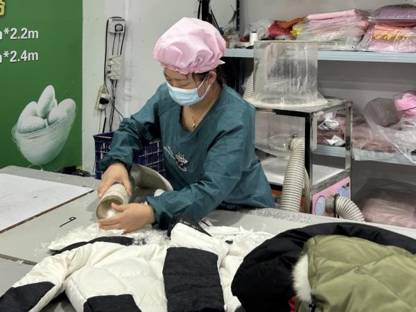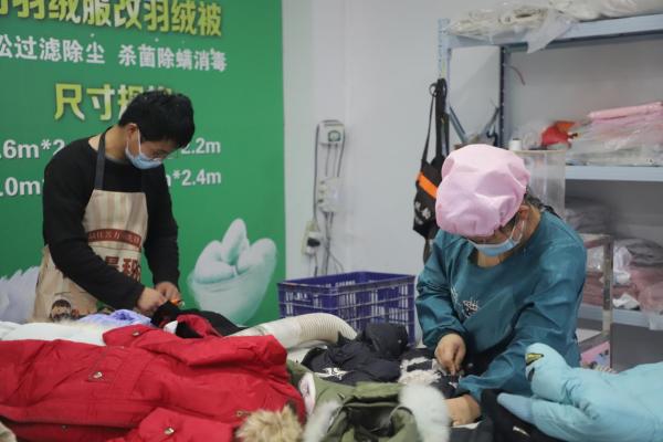 工作日的下午,记者来到一家生意红火的羽绒被翻新店。店主徐阿姨和儿子正在分工协作,进行充绒操作,随着一声声“好”,羽绒被在二人的手中慢慢“鼓”起来。在一旁等待的顾客陈伯伯告诉记者:“闺女每年冬天都要买新羽绒服,旧的就不穿了,放在家里太占地方。我听亲戚说,他常年在这家改羽绒被,我也就给拿过来了。”