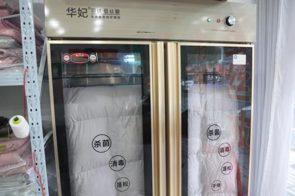 制作过程完成后,被子会被放入消毒机进行杀菌消毒。这样能够解决客户回家后的洗晒烦恼,直接使用新被子。为了防止窜绒,延长使用寿命,店主还会嘱咐顾客在取货后切勿拍打新被子。因为羽绒被中间有孔洞连接各块方格,拍打会使得羽绒移位。
