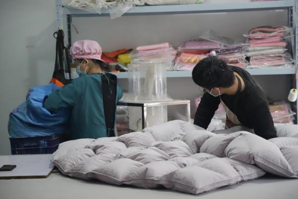 第三步:将处理好的羽绒充进羽绒被内胆中