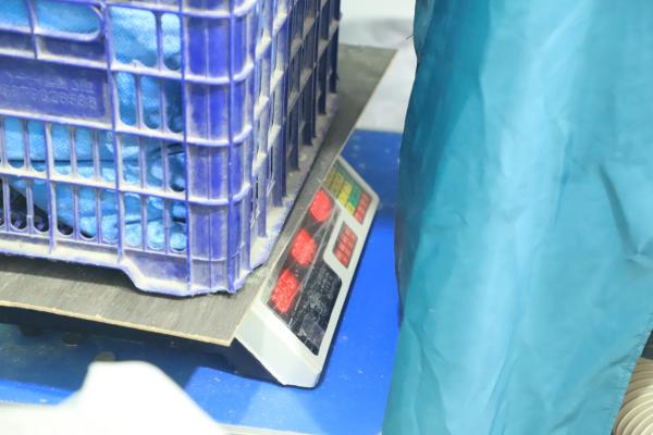 机器主体连接两根管道,左侧管道负责吸入拆出的羽绒,右侧管道将加工好的羽绒充入顾客选定的被子内胆中。这一步需要二人配合,一人根据被子尺寸、重量控制充绒量;另一人压住被子,确保每格内的羽绒是均匀的。