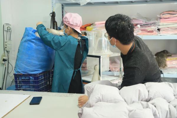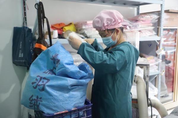 顾客取走羽绒被后,在有需要的时候,可以随时拿到店里进行专业的杀菌消毒。徐阿姨说:“顾客出于信任,选择我们店里制作被子,我当然也希望每床被子他们都可以用得更久。”